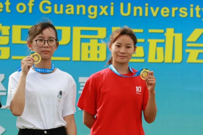 11、女子原地双手掷实心球艺术学院文靖6.88米、工商管理学院徐吴钰6.72米破校运会记录