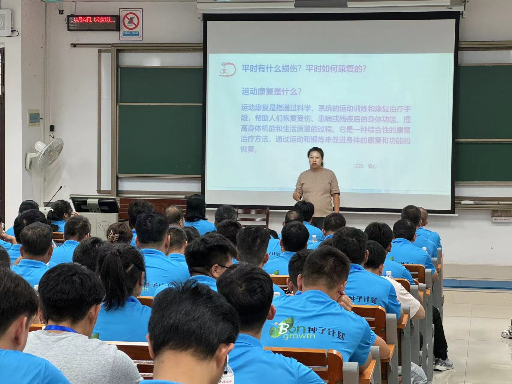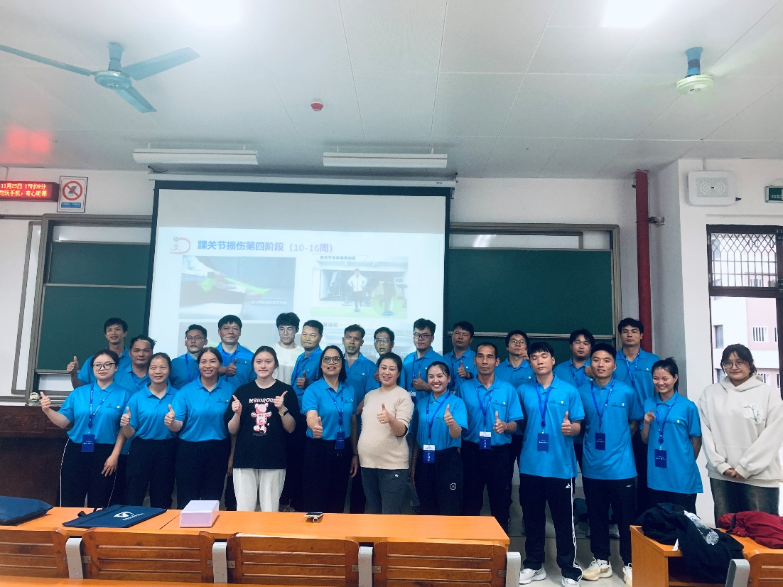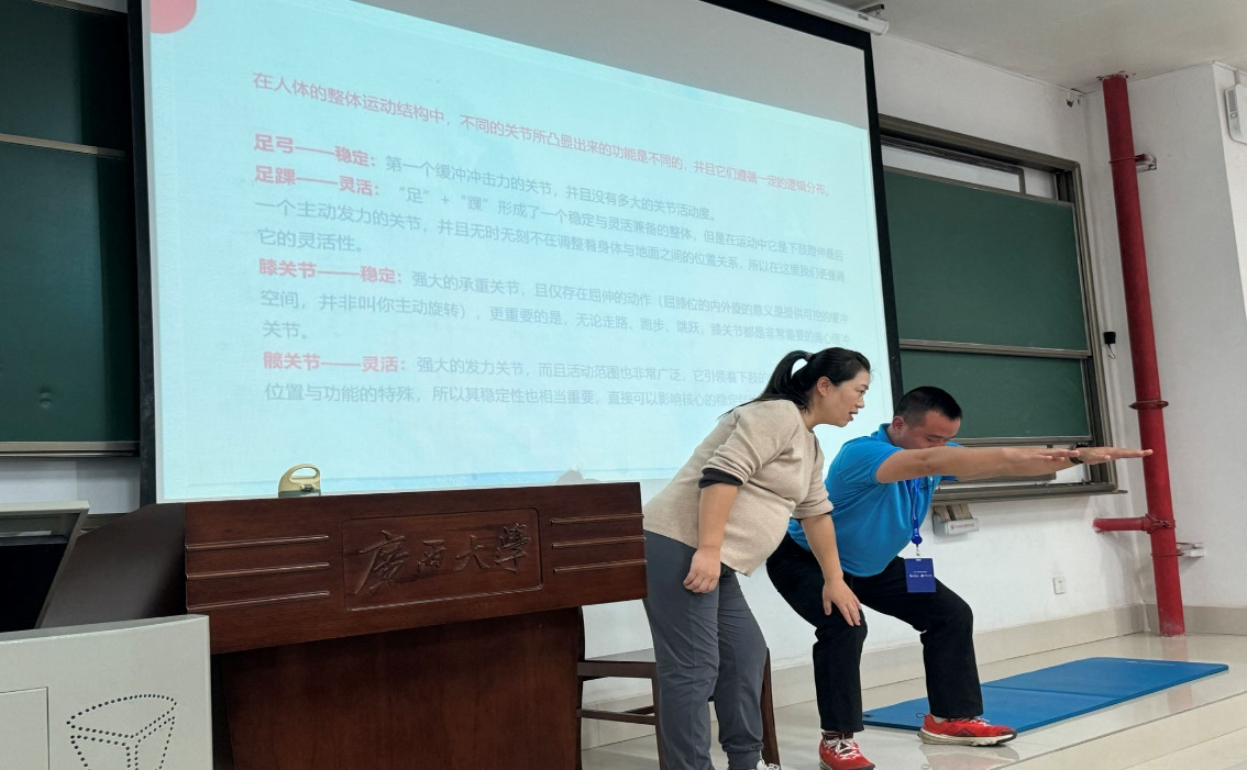 11月25日下午,由中国儿童少年基金会主办的“种子计划-帮助未来专项基金”南宁乡村体育教师公益培训《青少年运动损伤与康复》专题培训在第六教学楼6B-301室举行,运动人体科学教研室主任郭旭霞副教授在运动康复协会学生协助下为马山县130余名乡村中小学体育教师作了现场培训,受到与会基层教师的欢迎。