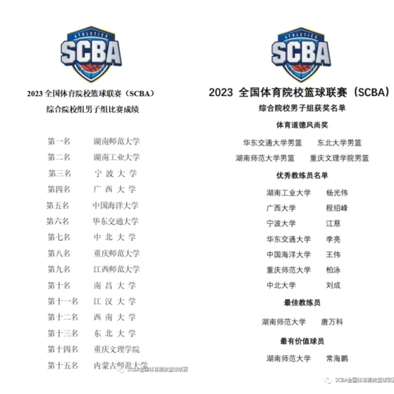 10月24日晚,2023赛季全国体育院校篮球联赛(SCBA)在广元市澳源体育中心体育馆圆满落幕,历经9天鏖战,我校男子篮球队屡克强敌,最终获得综合院校组第四名,主教练程绍峰被评为本届赛会优秀教练员,创造队史最佳成绩。