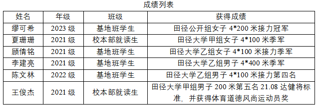 特别值得一提的是,王俊杰同学在男子甲组200米预赛中以21.08秒的个人最好成绩获得小组第一,达到国家健将标准,成为我校田径队第二个在校训练达到健将级的运动员,并以总成绩排名第5进入决赛。此成绩也是广西成年男子有史以来第二好成绩,距短跑名将陈文忠在1996年亚特拉大奥运会创造的21.07区最高记录仅差0.01秒。夏珊珊同学在个人单项100米、200米比赛中虽未进入决赛,但分别以12.38秒和25.18秒创造PB,达到一级运动员标准,并在甲组女子4*100米比赛中,担任第一棒位置,以46.00秒的优异成绩夺得铜牌。曾远有同学在100米比赛中跑出10.56秒佳绩,创造个人PB和太阳集团tyc234cc男子100米最高纪录。