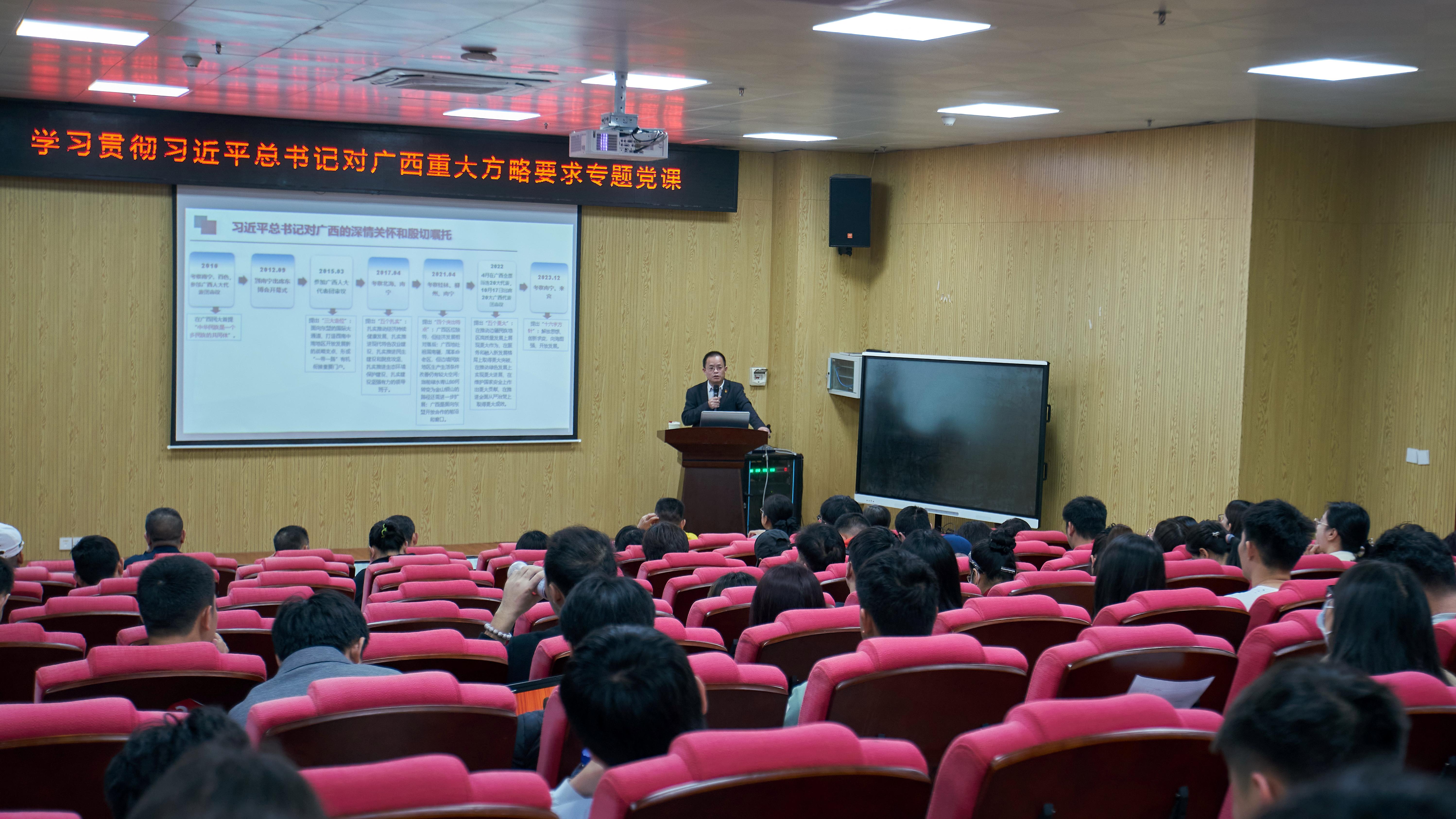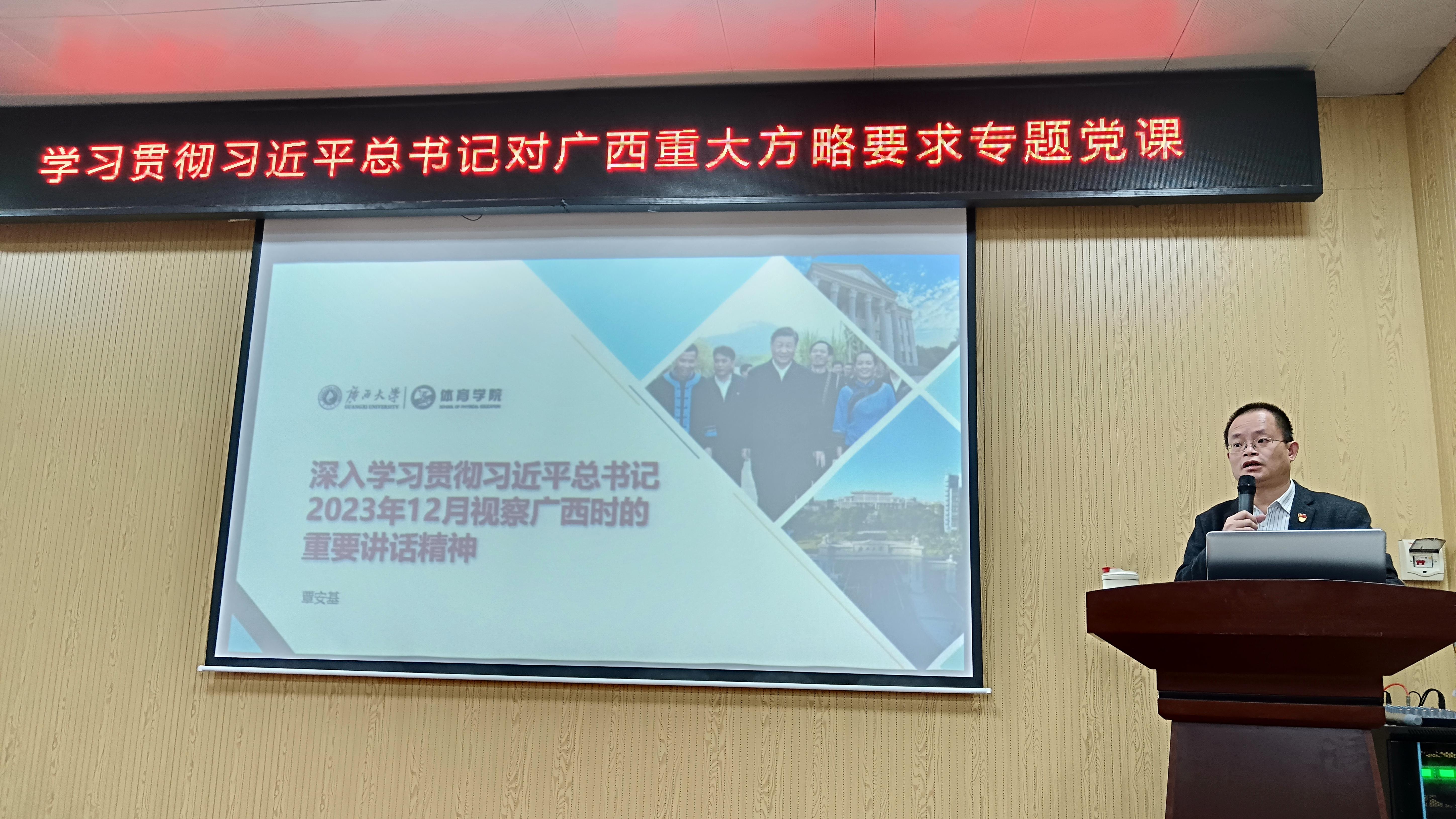 3月5日下午,院党委书记覃安基在西校园综合体育馆阶梯教室为全院党员讲授专题党课,传达学习习近平总书记2023年12月视察广西时的重要讲话精神,对学院学习宣传和贯彻落实工作作出部署。