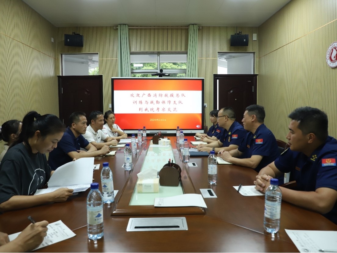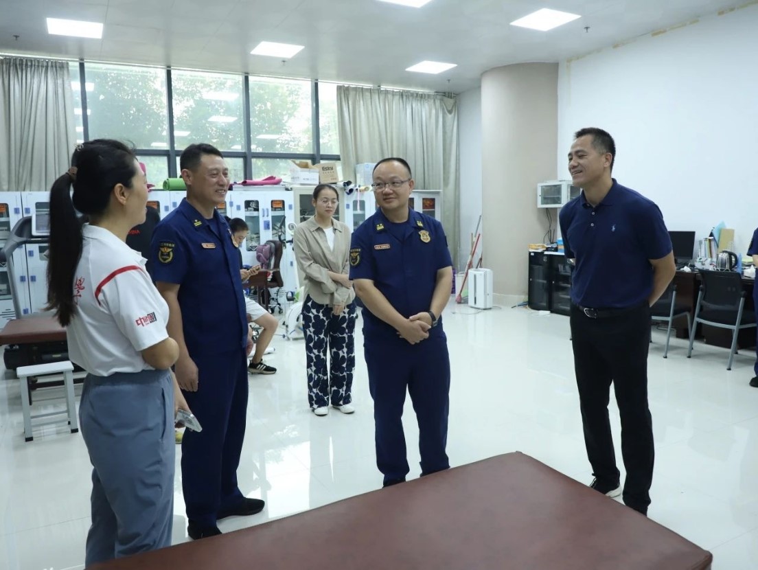 6月6日下午,广西消防救援总队训练与战勤保障支队支队长胡鹏,副支队长邓民等一行来我院调研交流,在黄海波副院长的陪同下参观了太阳成tyc234cc运动康复实验室、体能训练室、体质测试室等实验室及系列运动场馆,详细了解学院康复训练、体能训练和体质监测等器材配备情况。