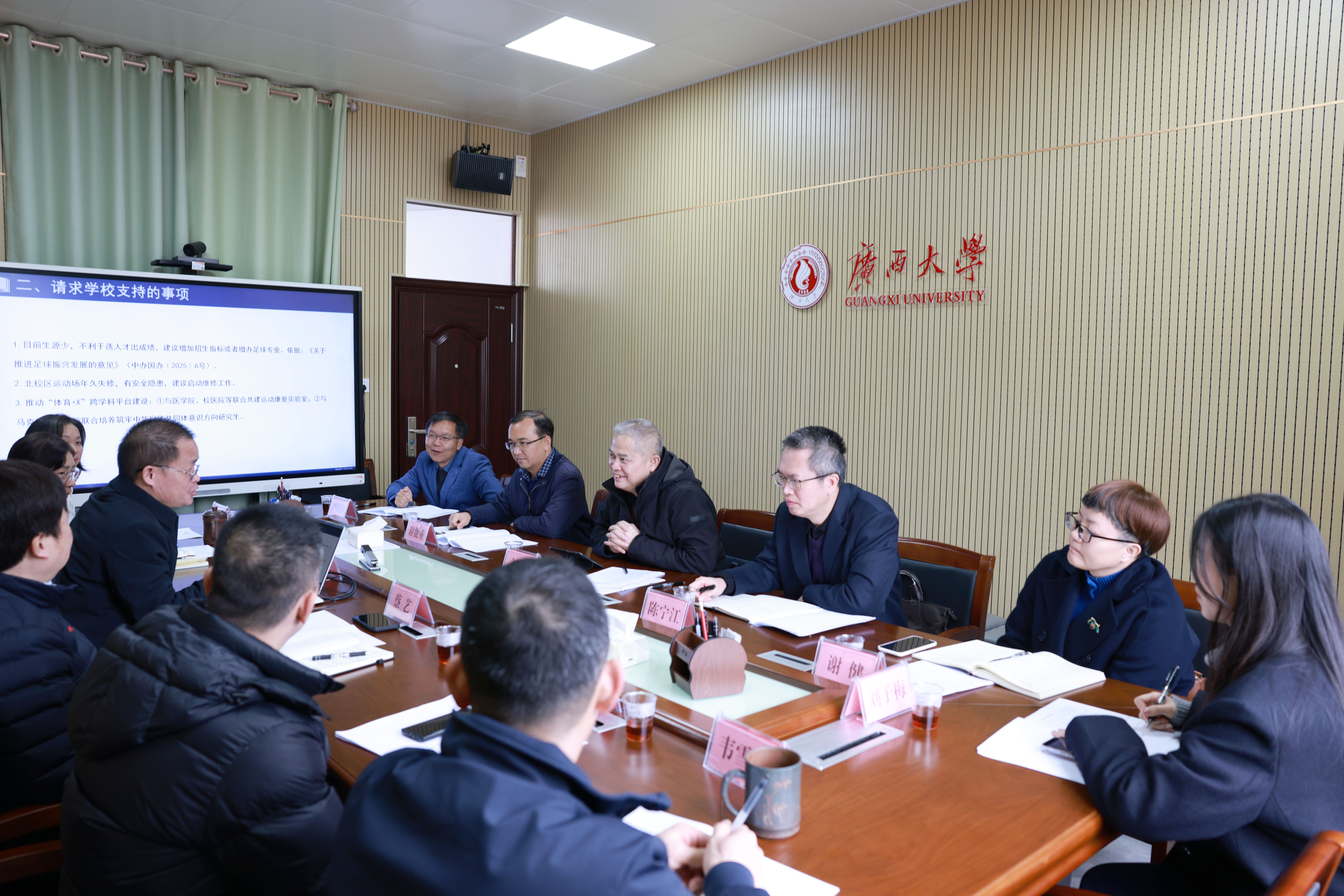 刘向强调,体育是学校育人的重要环节,在“五育并举”育人体系中占有重要地位。学院要全面落实立德树人根本任务,开齐上好公共体育课;要加强学校群众体育工作的引导和指导,做好师生身体健康这篇“大文章”;要加强运动队建设与管理,有层次、有重点推进队伍建设,多出成绩,提振士气;要加强教师队伍建设,在抓好内培的同时强化人才引进工作;要积极探索学科交叉融合,创新人才培养模式,一体推进人才培养和学科建设工作;要站在学校的层面谋划学院未来发展,紧密服务国家战略,面向东盟,服务广西,着力提升办学能力,提升西大体育的社会影响力和服务地方体育发展的能力;要多与上级主管部门汇报,主动对接校友体育活动,打通理顺工作关系,为学院发展夯实基础;要积极转变工作思路和工作观念,不断强化干部队伍能力建设,走创新发展新路,避开“等、靠、要”老路,发挥自身特色和优势,抢抓发展机遇,勇于开拓创新,为学校“双一流”建设作出新贡献。