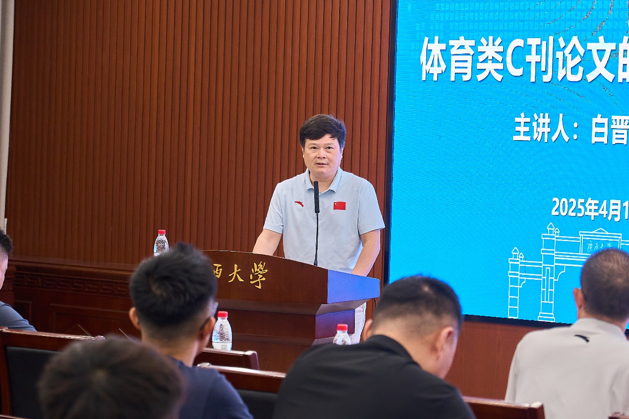 4月15日,应我院邀请,国内体育学界知名学者,湖南吉首大学原党委书记、校长白晋湘教授做客太阳集团tyc234cc君武大讲堂,为我院师生做题为《体育类C刊论文的构思与写作》专题讲座,受到师生的欢迎。