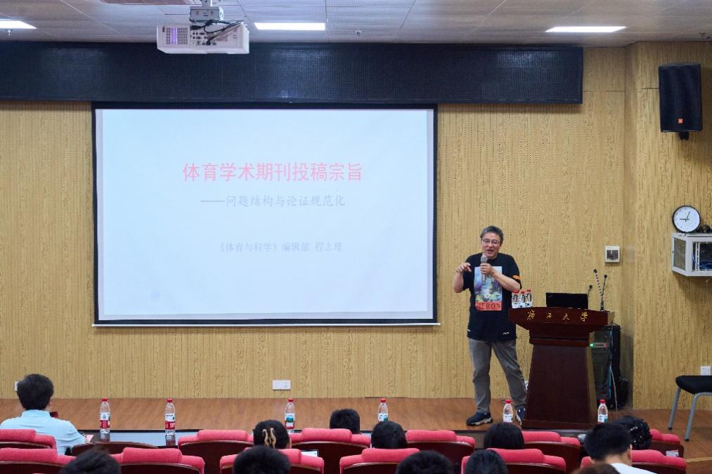 4月18日,应我院邀请,《体育与科学》杂志原主编、编审,江苏省体育科学研究所博士后工作站导师程志理在西校园体育馆学术报告厅为我院师生做题为《体育学术期刊投稿宗旨——问题结构与论证规范化》专题讲座,蔡艺教授主持讲座并点评,全院研究生及部分教师现场聆听。