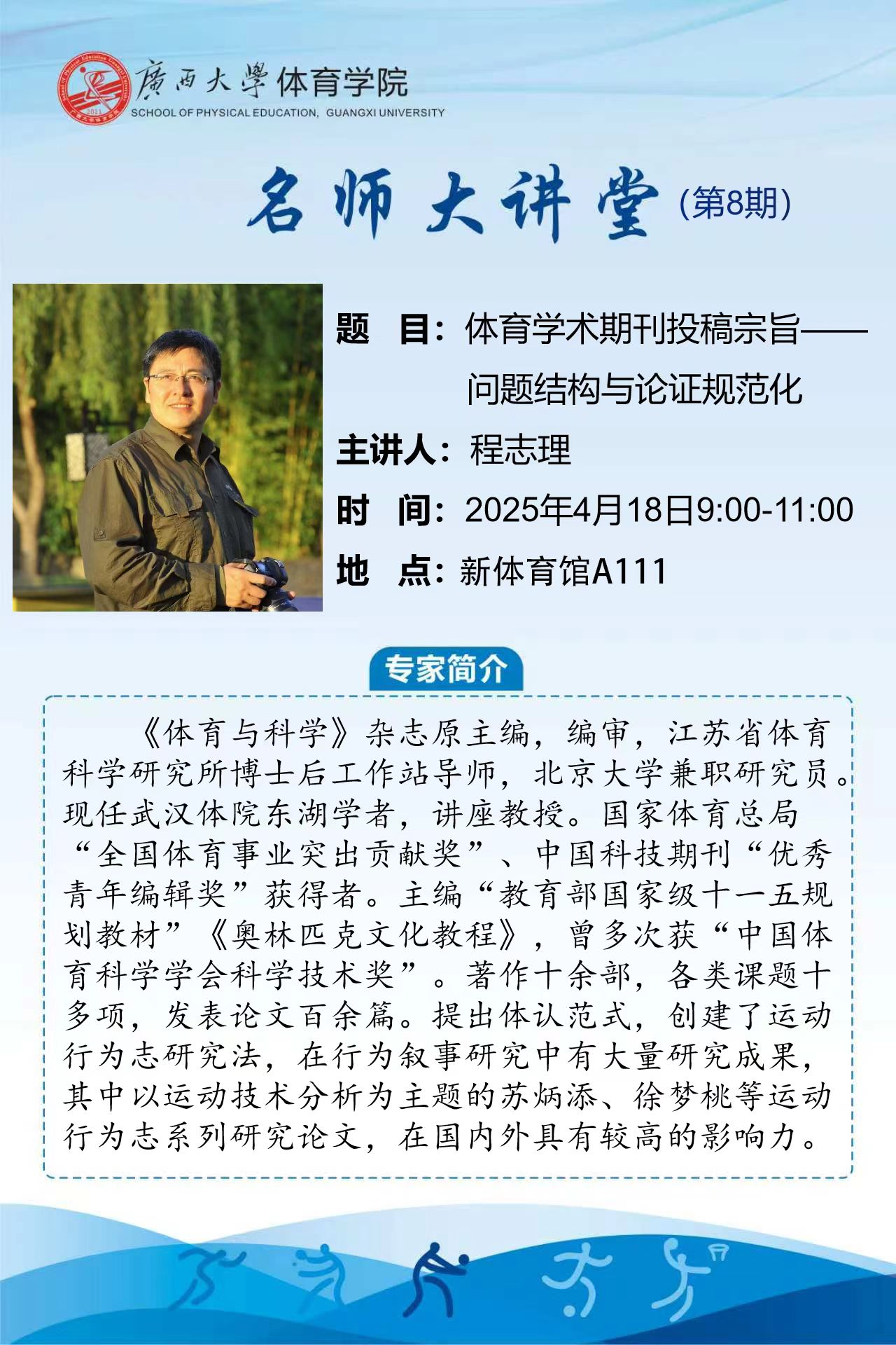 太阳成tyc234cc名师大讲堂(第8期):体育学术期刊投稿宗旨——问题结构与论证规范化